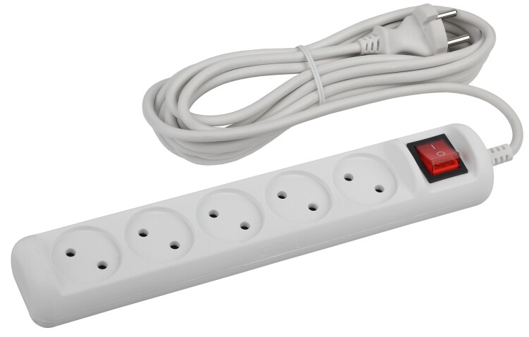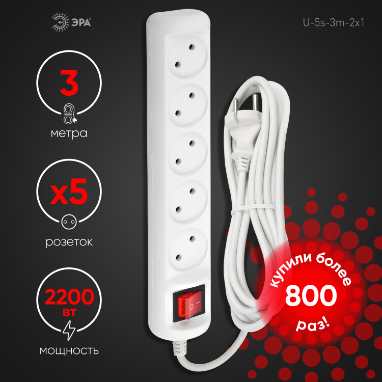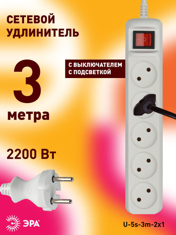 Удлинитель электрический Эра U-5s-3m-2x1 без заземления, c выключателем, 5 розеток, 3м ПВС 2x1мм2. Рассчитан на максимальную мощность 10А/2200. Удлинитель Эра станет Вашим надежным помощником, если Ваши любимые электроприборы находятся далеко от розеток. Провод в удлинителях Эра сделан из 100% меди, что делает его абсолютно пожаробезопасным. Корпус выполнен из ударопрочного и негорючего пластика (полипропилен). Модель удлинителя на 10А позволяет подключить бытовые приборы общей нагрузкой до 2200Вт. Дизайн удлинителя разработан в России командой Эра Style.