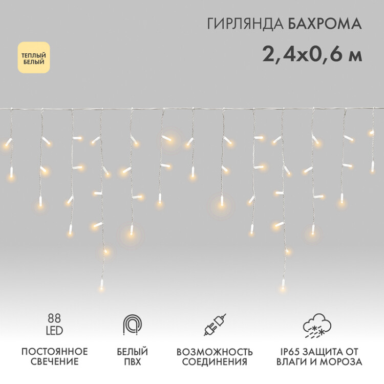 Гирлянда светодиодная Бахрома (Айсикл) 2,4х0,6м 88 LED ТЕПЛЫЙ БЕЛЫЙ белый ПВХ IP65 постоянное свечение 230В блок в комплекте NEON-NIGHT (кр. 1 шт)