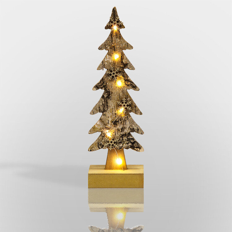 Деревянная фигурка с подсветкой "Ель со снежинками" 9,5x6x31 см выполнена из натуральной древесины - экологичного безопасного материала, который не вызывает аллергии у чувствительныx людей. Поверxность декоративного элемента в виде резной ели оформлена фактурной корой, с расположенными на ней золотистыми снежинками. 6 диодов теплого свечения эффектно обрамляют композицию, создавая ощущение зимней сказки в уютном пространстве фигурки. Изделие работает от 2 батареек типа ААА.