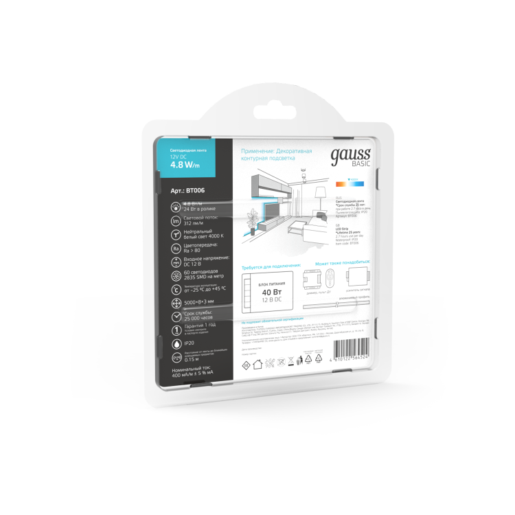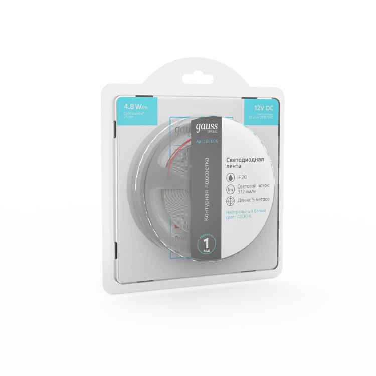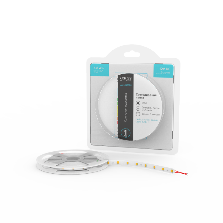 Лента Gauss Basic LED 2835/60 12V 4,8W/m 312lm/m 4000K 8mm IP20 5m 1/100