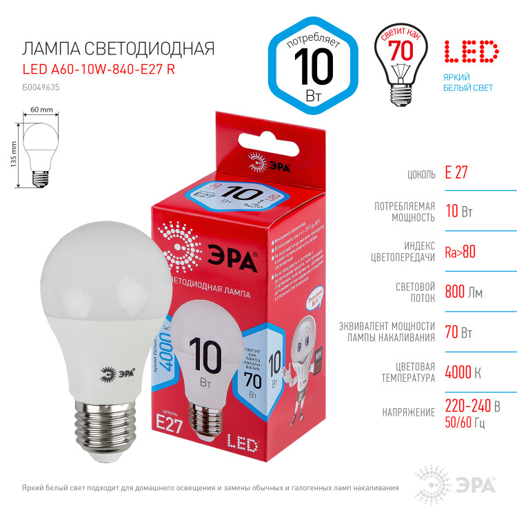 Эта светодиодная лампа ЭРА Серии Бюджет - современный, качественный и доступный источник света. Позволяет экономить до 90% электроэнергии по сравнению с лампой накаливания с аналогичным световым потоком. Светит ярким белым светом, который максимально приближен к естественному дневному. Идеальна для ежедневного применения в быту. Мгновенное включение. Ровное освещение. Можно испо льзовать как с люстрами, так и со светильниками, в том числе настольными и бра.