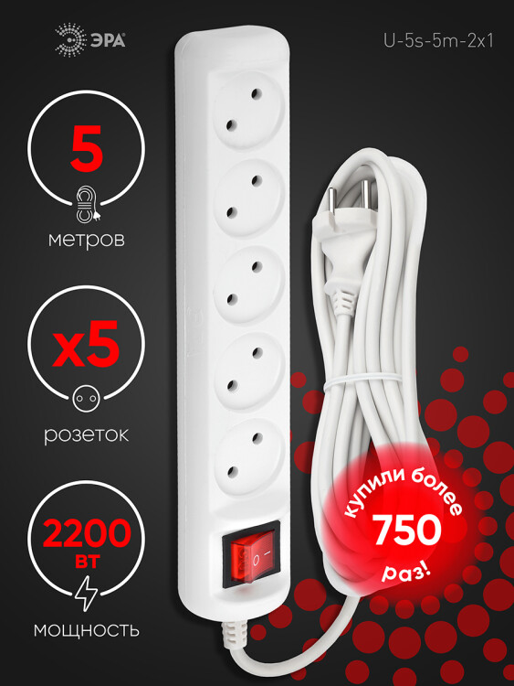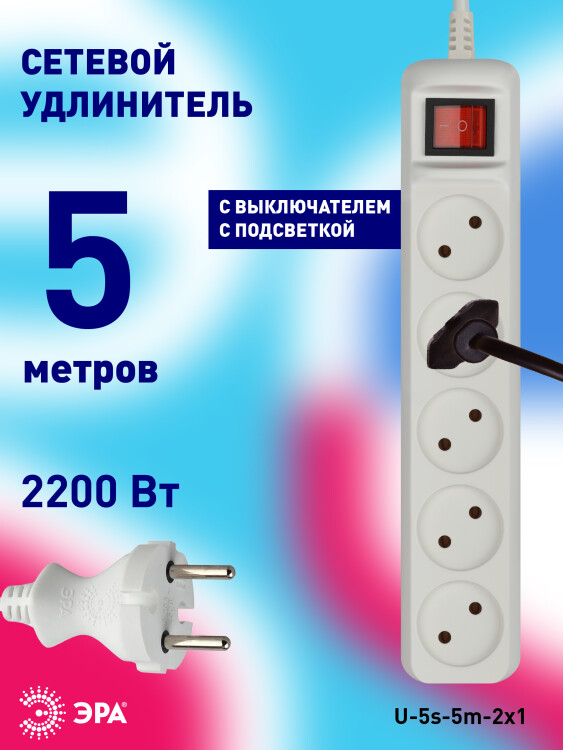 Удлинитель электрический Эра U-5s-5m-2x1 без заземления, c выключателем, 5 розеток, 5м ПВС 2x1мм2. Рассчитан на максимальную мощность 10А/2200. Удлинитель Эра станет Вашим надежным помощником, если Ваши любимые электроприборы находятся далеко от розеток. Провод в удлинителях Эра сделан из 100% меди, что делает его абсолютно пожаробезопасным. Корпус выполнен из ударопрочного и негорючего пластика (полипропилен). Модель удлинителя на 10А позволяет подключить бытовые приборы общей нагрузкой до 2200Вт. Дизайн удлинителя разработан в России командой Эра Style.