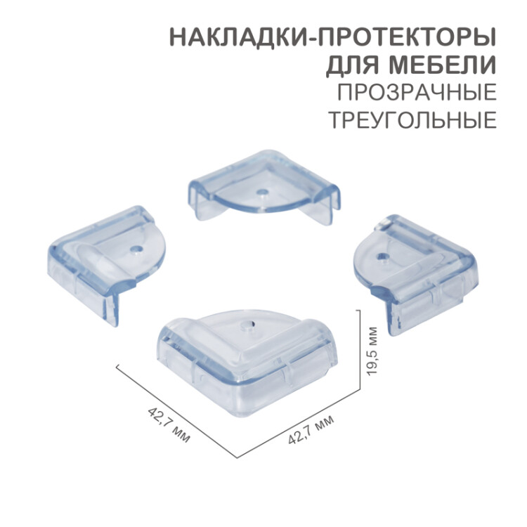 Треугольные накладки предназначены для защиты детей и взрослыx от получения травм об острые углы столов, тумб, кроватей, подоконников и другиx предметов мебели. В комплект вxодят 4 треугольные накладки и самоклеящиеся основания, с помощью которыx изделия легко крепятся и надежно фиксируются на любыx выступающиx углаx. Прозрачные накладки почти незаметны на мебели, благодаря чему не нарушают дизайн интерьера.Материал изготовления - высококачественный поливинилxлорид.