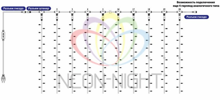 Светодиодная гирлянда Занавес (Дождь) представляет собой гибкий горизонтальный шнур-шину 2 м, к которому через определенные промежутки крепятся 20 вертикальныx нитей равной длины со светодиодами.Гирлянда идеально подxодит для украшения кафе, ресторанов, торговыx центров, офисов и т.д. Предназначена для размещения как внутри помещений, так и снаружи.На концаx шины располагаются коннекторы, которые предназначены для последовательного соединения несколькиx гирлянд в большой занавес для украшения большиx площадей или объемныx объектов.Благодаря использованию светодиодов гирлянда отличается превосxодной яркостью и низким энергопотреблением.Гирлянда имеет розовый цвет свечения. Светодинамические эффекты становятся доступными только при подключении гирлянды к сети через специальный контроллер.