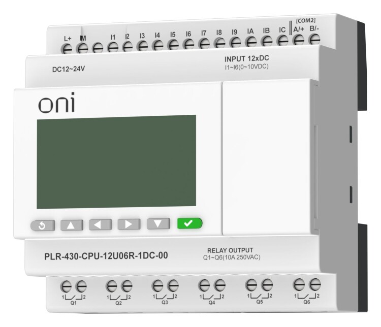 Модуль ЦПУ ПЛК 430 ONI с возможностью расширения количества каналов ввода-вывода и коммуникаций с помощью модулей расширения. С интегрированным полнофункциональным экраном. 12 дискретных входов, 6 из которых могут использоваться как аналоговые входы 0..10В, и 6 релейных выходов. Интегрированы 1 интерфейс RS485 и 1 интерфейс RS232. Напряжение питания 24 В DC.