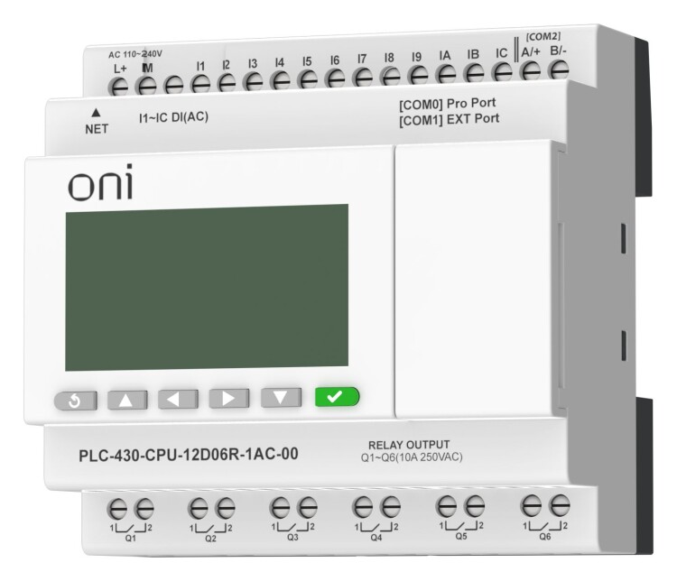 Модуль ЦПУ ПЛК 430 ONI с возможностью расширения количества каналов ввода-вывода и коммуникаций с помощью модулей расширения. С интегрированным полнофункциональным экраном. 12 дискретных входов, 6 релейных выходов. Архивация данных процесса при использовании стандартной SD карты. Интегрирован 1 интерфейс RS232 и 1 интерфейс Ethernet с поддержкой Modbus TCP/RTU/ASCII и MQTT протоколов. Напряжение питания 220В AC.