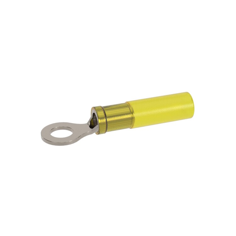 Предназначен для оконцевания медных/алюминиевых многопроволочных жил кабелей/проводов в электрических цепях переменного/постоянного тока напряжением до 600 В. Контактная часть выполнена из высококачественной меди марки М1. Лужение исключает образование гальванической пары. Внутренняя часть гильзы имеет радиальные насечки, повышающие плотность контакта. Изоляция из полиэтилена выдерживает температуру до 125 ⁰C. Класс горючести - HB, стандарт UL 94. Термоусадочная манжета обеспечивает герметичность соединения. Не обладает клеевым слоем. Цвет - желтый. Сечение: 4-6 мм2. Диаметр отверстия клеммы 6,4 мм. Метиз - М6. Форма контактной части - кольцо.
