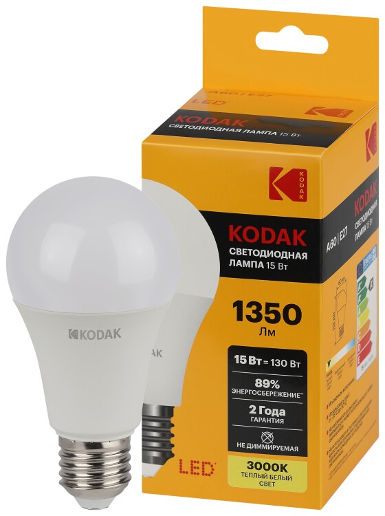 Представляем Вашему вниманию новинку от легендарного бренда Kodak - светодиодные лампочки, которые украсят Ваш интерьер и наполнят дом светом. Лампы всемирно известной марки отличаются традиционно высоким качеством, продолжительным сроком службы, эксплуатационной надежностью, и, конечно, доступной ценой. LED KODAK A60-15W-830-E27 - лампочка с цоколем E27, отлично подойдет для самых разных целей: ее можно установить в люстру или светильник на кухне, в спальне, детской комнате или коридоре. Мощность лампы составляет 15Вт, эквивалент лампе накаливания - 130Вт. Цветовая температура - 3000К - теплый свет, подобный к свечению ламп накаливания. Такой свет идеально подойдет для спальни или детской комнаты, благодаря теплому свету помещение наполнится атмосферой тепла и уюта. Диаметр лампочки составляет 60мм, а высота - 118мм. Корпус устройств выполнен из высококачественных алюминия и термо пластика, что делает использование источников света абсолютно безопасным. Невозможно оставить без внимания неоспоримые преимущества технологии, в которой выполнены лампы: LED (светодиоды KODAK). В первую очередь, это высокая светоотдача и низкое энергопотребление: эти источники света тратят в 10 раз меньше, чем лампы накаливания. Срок службы - 35000 часов - более чем 3,5 года постоянного свечения. Еще одно преимущество - светодиоды не содержат в себе ртути и прочих вредных металлов. Купив лампу от Kodak, Вы сможете быть уверены в высоком качестве продукта и безопасности своих близких.