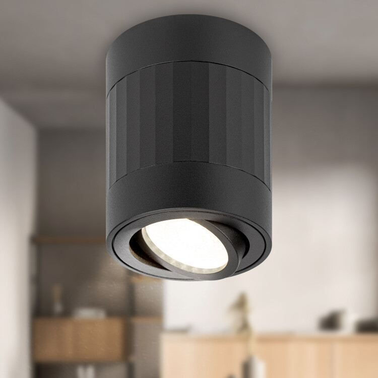 Накладной светильник OL34 BK делает помещение зрительно более стильным и интересным. Благодаря поворотному механизму светильник может создавать дополнительные световые акценты в помещении. Используя по периметру несколько однотипных осветительных устройств, можно сформировать интеренсые световые геометрические рисунки. Цоколь для источника света GU10, напряжение питания ~230В 50/60Гц, материал алюминий, железо, цвет светильника черный, размер D80*H100мм, максимальная мощность лампы 12Вт, степень защиты IP20