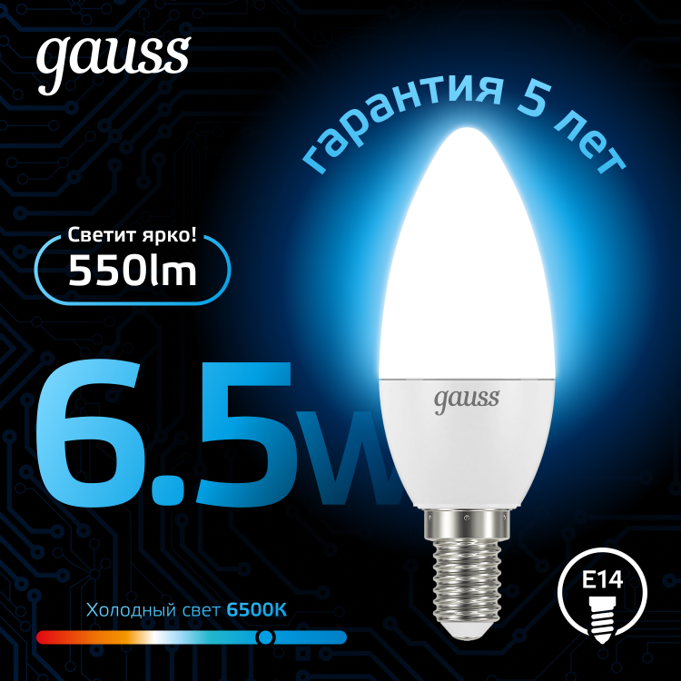 Лампа Gauss Свеча 6.5W 550lm 6500К E14 LED 1/10/100