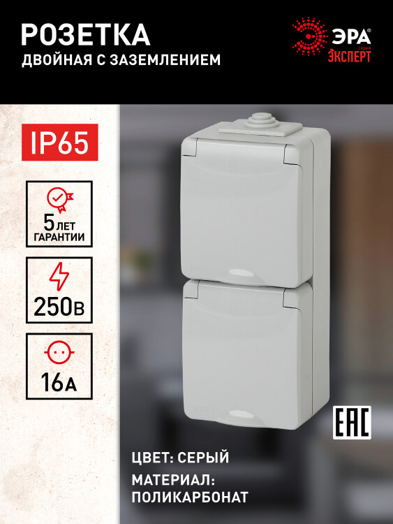 Розетка двойная вертикальная IP65 с крышкой серии Эра Эксперт открытой установки цвет белый 11-2607-03. Номинальные характеристики 16А 250В. Устройство выполнено из качественного поликарбоната, оснащёно уникальными винтовыми клеммами ЭКСПЕРТ для максимально качественного зажима кабеля в механизме.
