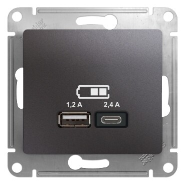 Розетка Systeme Electric (ранее Schneider Electric) серии Glossa (цвет графит) двойная USB с разъемами типа A+C. Выполнена из материала PС+ASA, стойкого к УФ-излучению и появлению царапин. Самая современная USB-зарядка с двумя разъемами позволяет заряжать как стандартные мобильные устройства через разъем типа А, так и новейшие устройства, в том числе ноутбуки, с разъемом типа С.