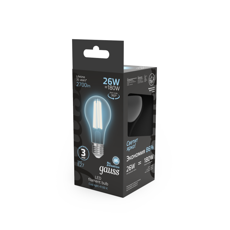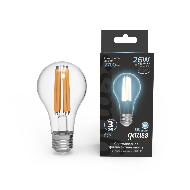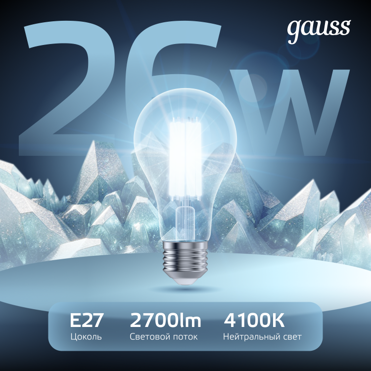 Светодиодные филаментные лампы GAUSS - это новейшие технологии в светотехнике. Лампы имеют привычный вид классических ламп накаливания, освещают пространство на 360о и дают больше света по сравнению с обычными светодиодными лампами за счет прозрачной колбы. Идеально подходят для хрустальных люстр и открытых светильников, а также для реализации дизайнерских решений, где важен вид классических ламп накаливания.