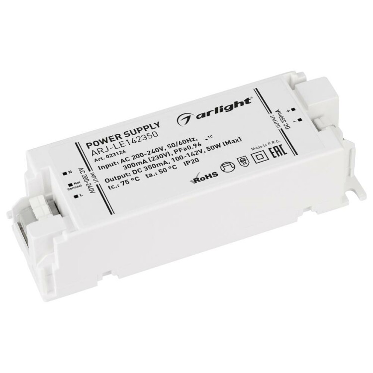 Источник тока с гальванической развязкой для светильников и мощных светодиодов. Входное напряжение 220-240 VAC. Выходные параметры: 100-142 В, 350 mА, 50 Вт. Встроенный PFC >0.96. Негерметичный пластиковый корпус IP 20. Габаритные размеры длина 122 мм, ширина 43 мм, высота 30 мм. Гарантийный срок 3 года.