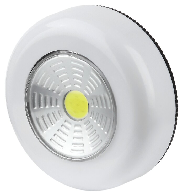 Светодиодный пушлайт ТРОФИ включается и выключается лёгким нажатием на корпус. Работает от 3 мизинчиковых батареек ААА. Одного комплекта алкалиновых элементов питания хватит на 5 часов непрерывной подсветки. Светит ярко благодаря современному COB-светодиоду. Источник света не перегорает и не тускнеет со временем. За счёт эргономичной круглой формы, малого веса и базового белого цвета фонарик прекрасно смотрится в любом интерьере.