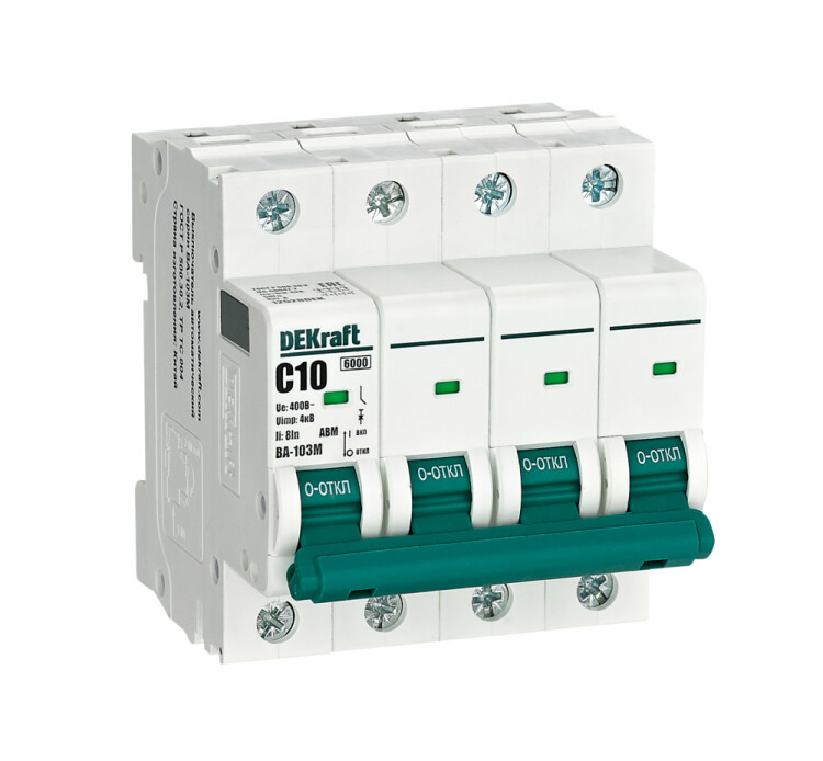 Автоматический выключатель без теплозащиты серии ВА-103M DEKraft; 4P; ном. ток 10 А; ном. раб. напряжение 400 В; кривая отключения C. Автоматические выключатели серии ВА-103М имеют специальное назначение для систем противопожарной защиты и вентиляции и выдерживают ток КЗ до 6000 А. Также они могут использоваться для нечастых оперативных включений и отключений указанных цепей. Автоматические в ыключатели соответствуют директиве RoHS, имеют расширенный диапазон рабочих температур от -25 до +60 °C, удобны и безопасны в эксплуатации.