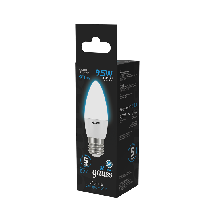 Лампа Gauss Свеча 9.5W 950lm 6500К E27 LED 1/10/50