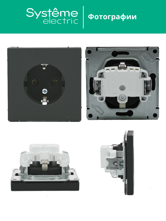 Механизм Systeme Electric серии ArtGallery в цвете базальт розетки одинарной с заземлением и без шторок подходит для сетей 250 В, на ток 16 А.