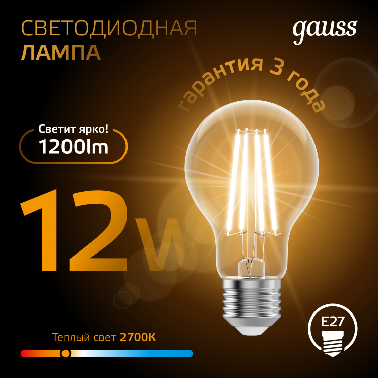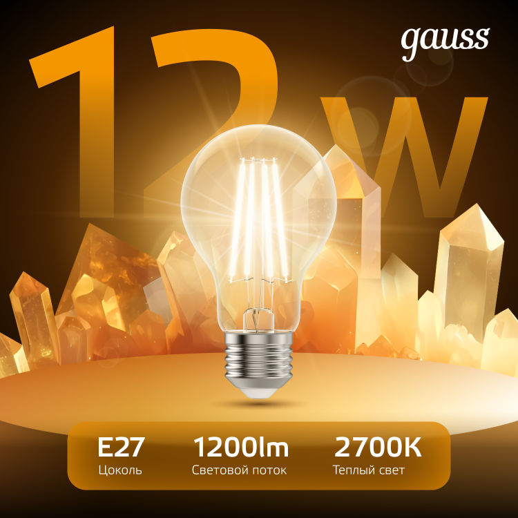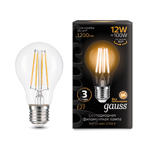 Лампа Gauss Filament А60 12W 1200lm 2700К Е27 LED 1/10/40