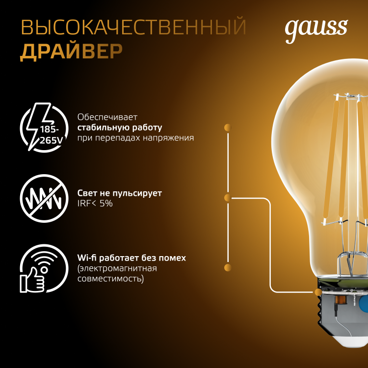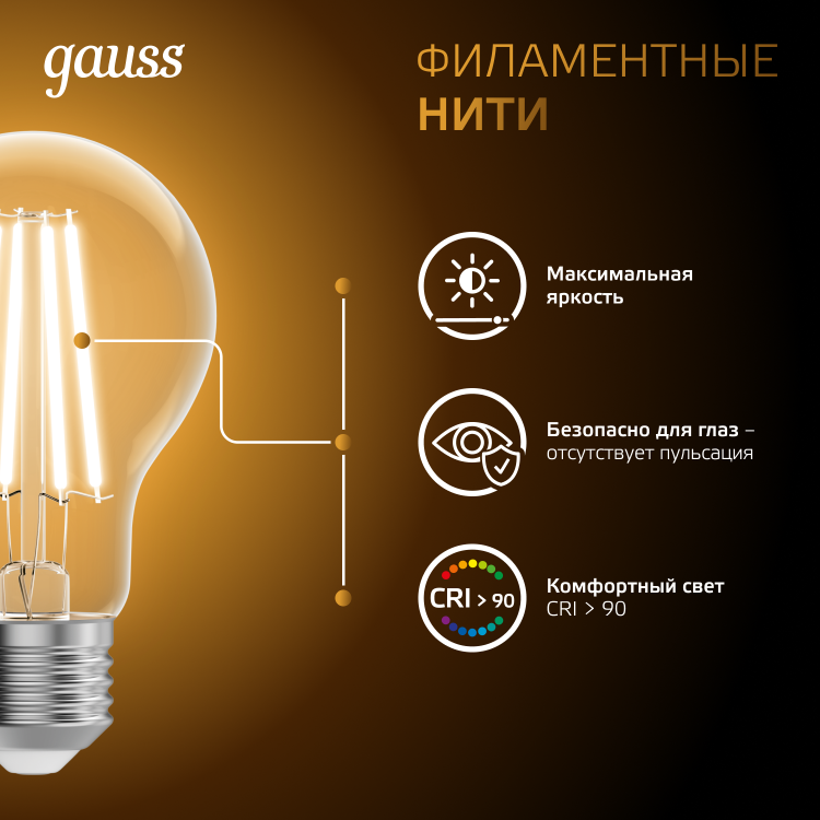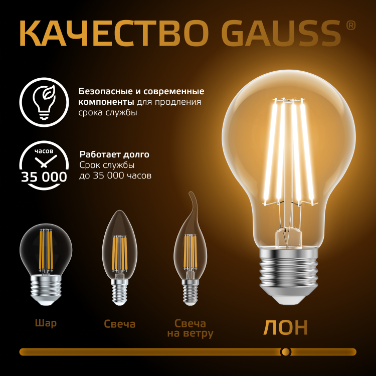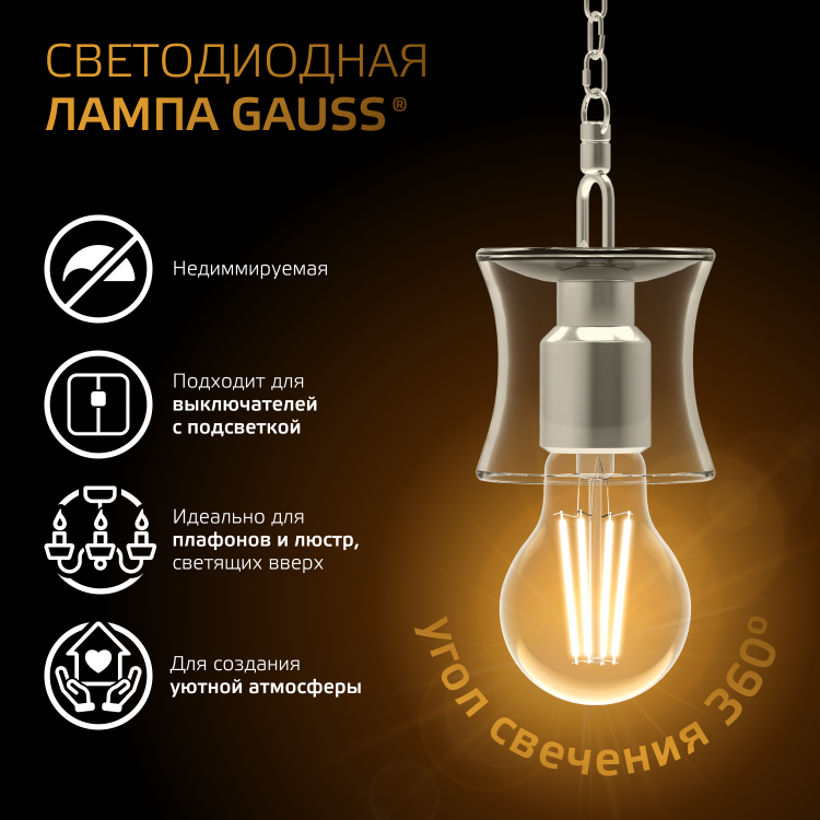 Светодиодные филаментные лампы GAUSS - это новейшие технологии в светотехнике. Лампы имеют привычный вид классических ламп накаливания, освещают пространство на 360о и дают больше света по сравнению с обычными светодиодными лампами за счет прозрачной колбы. Идеально подходят для хрустальных люстр и открытых светильников, а также для реализации дизайнерских решений, где важен вид классических ламп накаливания.