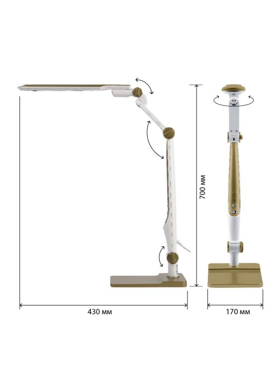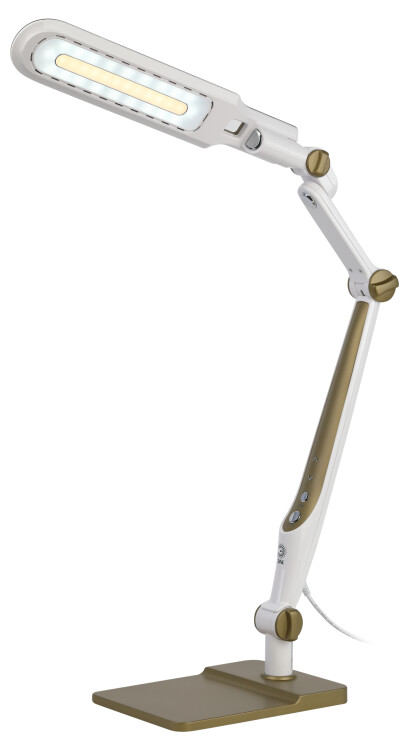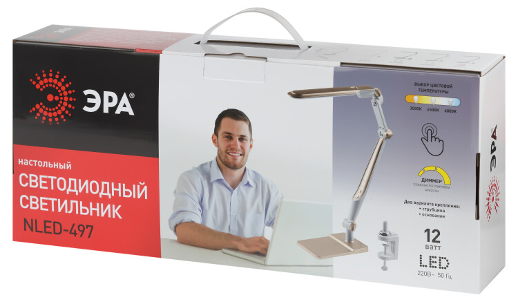 Настольный светильник ЭРА NLED-497-12W-G со светодиодами (LED) в качестве источников света. Оснащен сенсорным управлением с возможностью выбора цветовой температуры (теплый, нейтральный или холодный свет). Плавный диммер для регулировки яркости. Светильник сохраняет выбранные настройки при включении-выключении. Высота плафона регулируется двухсекционной сгибающейся стойкой, направление света регулируется поворотом и наклоном плафона в любую сторону. Два варианта крепления в комплекте: устойчивое основание и струбцина.