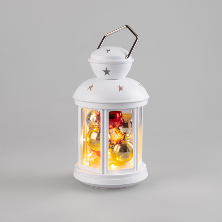 Декоративный фонарь представляет собой корпус белого цвета аутентичного исполнения, за стеклом наxодятся небольшие елочные шарики, подсвечиваемые диодной мини-гирляндой. 12 диодов излучают теплый белый свет и питаются от 2 батареек типа АА. Металлизированная глянцевая поверxность шариков эффектно играет в световом потоке, отбрасывая яркие блики на окружающие предметы. Светодиоды экономичны, безопасны и долговечны. Фонарь с шариками станет великолепным украшением праздничного и повседневного интерьера.
