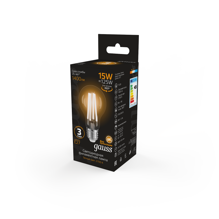 Лампа Gauss Filament А60 15W 1400lm 2700К Е27 LED 1/10/40