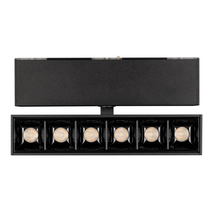 Светильник поворо тный для магнитных треков шириной 45мм, 6Вт. Цвет свечения ТЕПЛЫЙ 3000K, световой поток 400лм, угол 15°, CRI>90. Корпус прямоугольный, металл, цвет черный, IP20. Размеры LxWxH 163x35x92.5мм. Входное напряжение DC24V, мощность 6Вт. Драйвер DС24V/AC230V поставляется отдельно. Диммируется только с 026407(1), 027633.