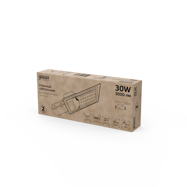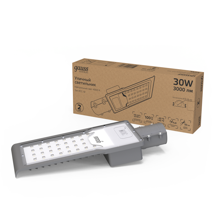Светильник уличный Gauss LED Avenue 30W это консольный LED светильник, корпус которого изготовлен из анодированного алюминия и прозрачного пластикового рассеивателя. У него высокий уровень пылевлагозащиты IP 65 и защиты от импульсных помех. Светильник легко монтируется на консоль. Работает в большом диапазоне температур от -40 до +45°С и имеет холодный белый свет 4000К, который дает максимальное освещение необходимой территории. Светильник не боится грозы, может использоваться для освещения улиц, участков дорог, придомовых территорий, парковых аллей.
