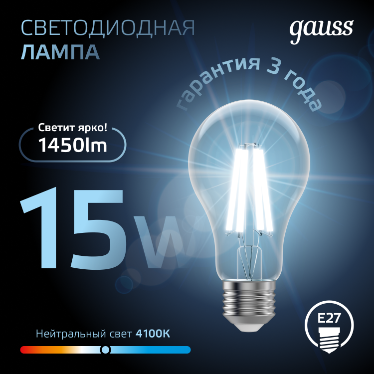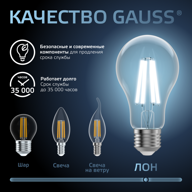 Светодиодные филаментные лампы GAUSS - это новейшие технологии в светотехнике. Лампы имеют привычный вид классических ламп накаливания, освещают пространство на 360о и дают больше света по сравнению с обычными светодиодными лампами за счет прозрачной колбы. Идеально подходят для хрустальных люстр и открытых светильников, а также для реализации дизайнерских решений, где важен вид классических ламп накаливания.