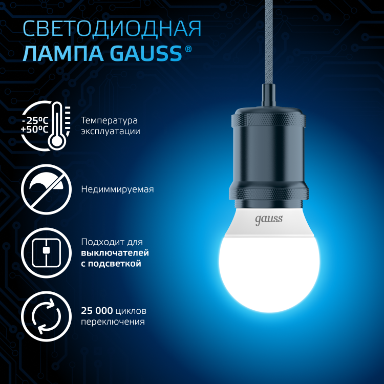 Светодиодные лампы Gauss Black в форме шара подойдут для большинства светильников, так как в категории присутствуют два вида цоколя. Светодиодные лампы Gauss Black активно используются для освещения жилых и офисных помещений. Лампы излучают приятный свет, который комфортен для глаз, без эффекта пульсации. Матовая колба ламп равномерно рассеивает свет и подходит для открытых светильников и прозрачных плафонов. Все лампы Gauss при колебаниях напряжения лампы не теряют яркость и не мерцают.