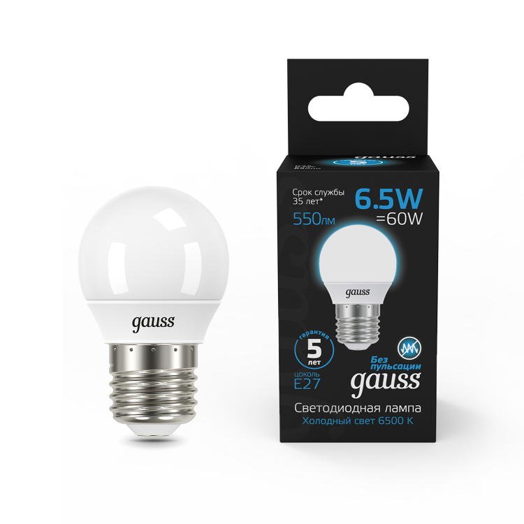 Лампа Gauss Шар 6.5W 550lm 6500K E27 LED 1/10/100