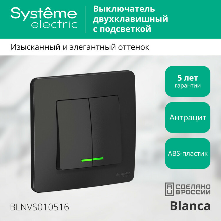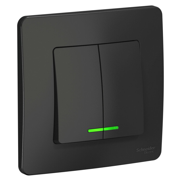 Выключатель Systeme Electric (ранее Schneider Electric) BLANCA (антрацит, скрытой установки) двухклавишный предназначен для сетей до 250В, на ток до 10А. Подсветка делает его легко находимым в отсутствие освещения. Двухклавишный выключатель позволяет управлять двумя источниками света из одной точки.