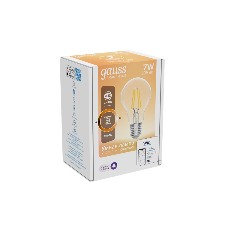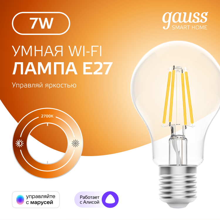 Умная Wi-fi филаментная лампочка Gauss Smart Light DIM E27 A60 7 Вт 2700-6500K, диммируемая, управление голосом/смартфоном
