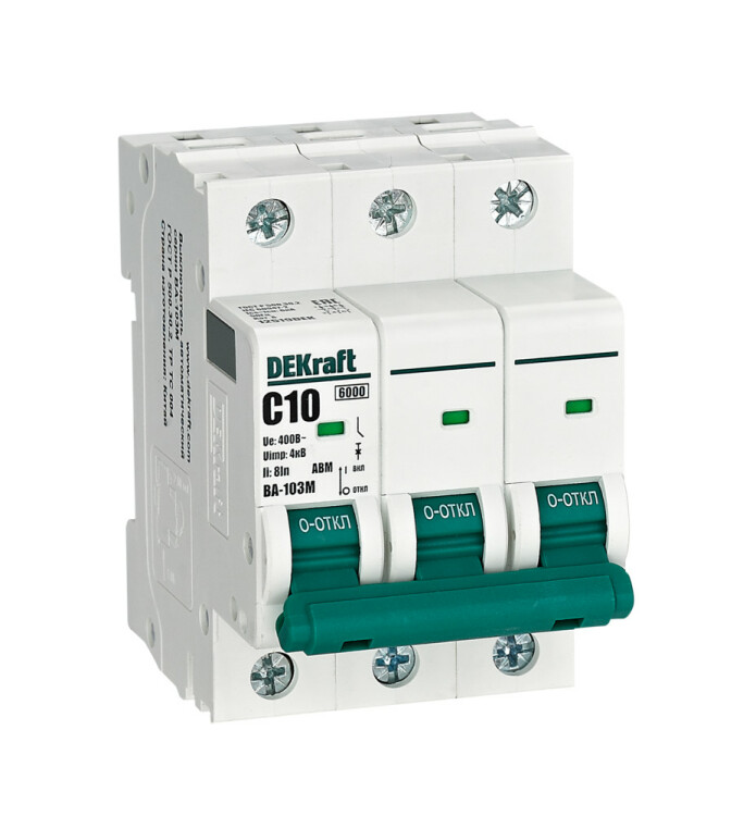 Автоматический выключатель без теплозащиты серии ВА-103M DEKraft; 3P; ном. ток 10 А; ном. раб. напряжение 400 В; кривая отключения C. Автоматические выключатели серии ВА-103М имеют специальное назначение для систем противопожарной защиты и вентиляции и выдерживают ток КЗ до 6000 А. Также они могут использоваться для нечастых оперативных включений и отключений указанных цепей. Автоматические в ыключатели соответствуют директиве RoHS, имеют расширенный диапазон рабочих температур от -25 до +60 °C, удобны и безопасны в эксплуатации.