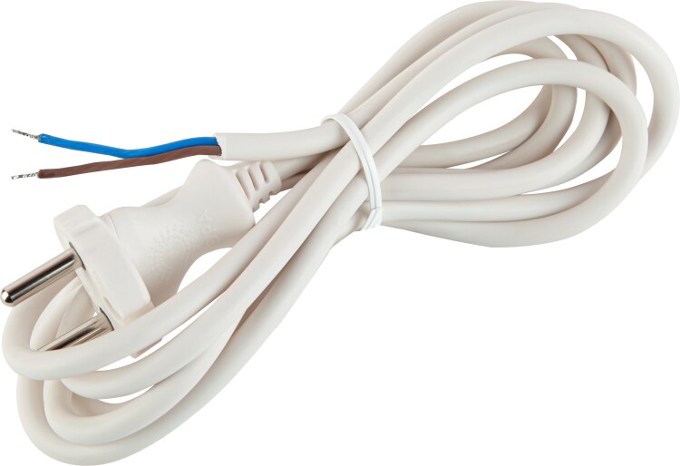 Шнур питания с вилкой UX-2x0,75-2m-W без заземления, провод ПВС с сечением 2x0,75мм2, длина 2 м, цвет - белый. Провод шнура питания состоит из скрученных жил с надежной ПВХ оболочкой. На конце шнура имеется штепсельная вилка. Изделие предназначено для комплектации или ремонта электрических бытовых приборов.