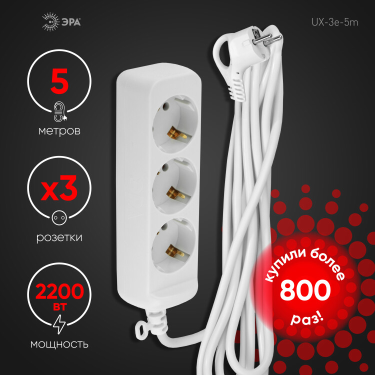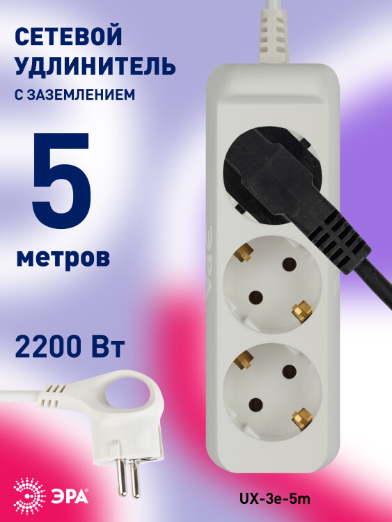 Удлинитель электрический Эра UX-3e-5m с заземле нием, ПВС, 3x0,75мм2, 3 розетки, 5 м. Рассчитан на максимальную мощность 10А/2200 Вт. Удлинитель Эра станет Вашим надежным помощником, если Ваши любимые электроприборы находятся далеко от розеток. Провод в удлинителях Эра сделан из 100% меди, что делает его абсолютно пожаробезопасным. Корпус выполнен из ударопрочного и негорючего пластика (полипропилен). Вилка обеспечена кольцом для удобного извлечения ее из розетки. Модель удлинителя на 10А позволяет подключить бытовые приборы общей нагрузкой до 2200Вт. Дизайн удлинителя разработан в России командой Эра Style.