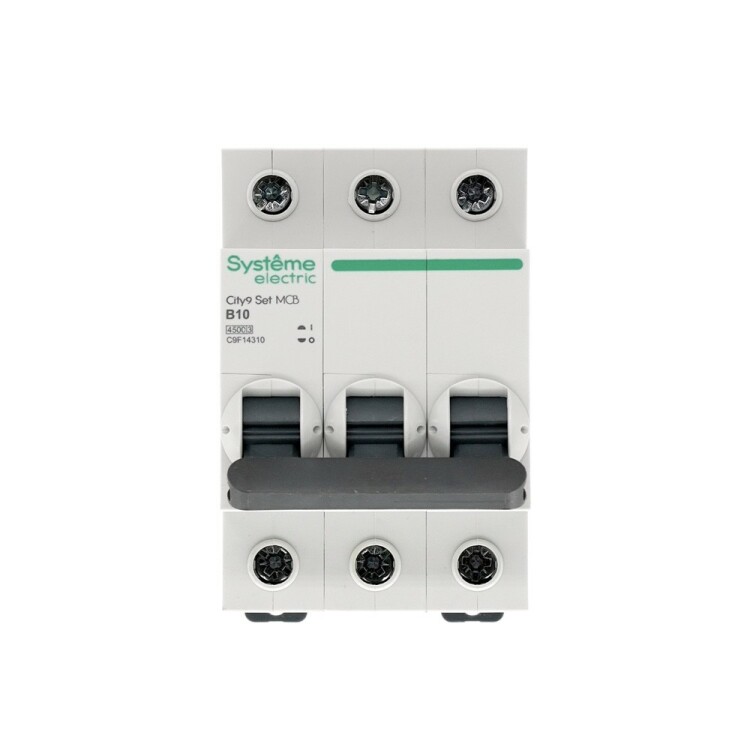 Автоматический выключатель серии City9 Set Systeme Electric, 3-полюсный, номинальный ток 10 А, характеристика B, Icn = 4.5 кА. Применяется в электрических сетях напряжением 400 В. Предназначен для защиты от перегрузок и токов короткого замыкания. Оснащен механизмом «мгновенной коммутации». Ударопрочный корпус из специального пластика с 6 металлическими заклепками. Безопасные клеммы исключают попадание кабелей в заклеммное пространство (ранее Schneider Electric Easy9 EZ9F14310).