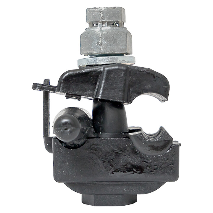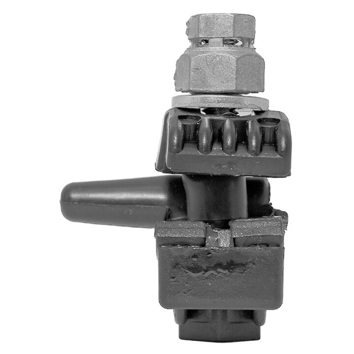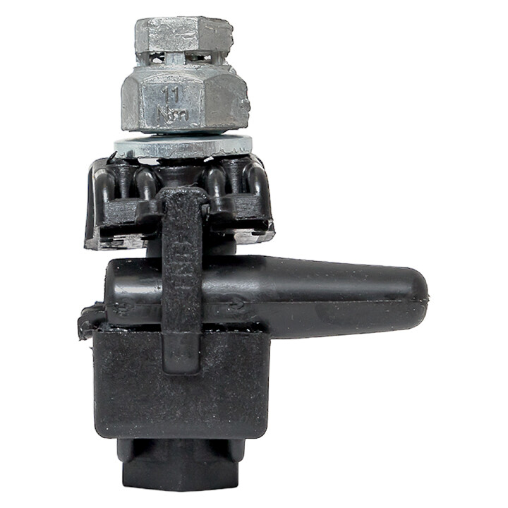 Зажим типа p-6x-95 предназначен для герметичного электрического соединения и ответвления абонентских проводов, а также проводников освещения от магистрали. Контакт с изолированным проводом обеспечивается прокалыванием изоляции. При достижении момента, необходимого для создания надежного электрического контакта проводов, происходит срыв головки болта. Контактные пластины изготовлены из алюминиевого сплава. На прокалывающие элементы нанесена контактная смазка. Болт изолирован от контактных деталей зажима. Зажим устойчив к ультрафиолетовому и солнечному излучению, высоким и низким температурам, коррозии и агрессивным атмосферным воздействиям.