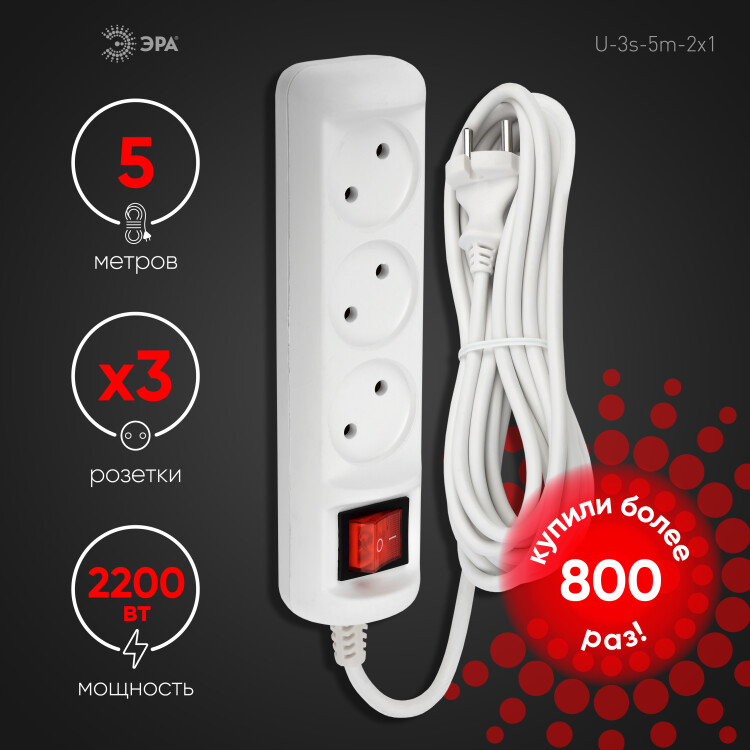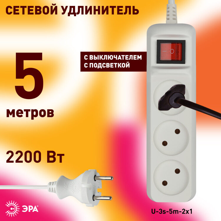 Удлинитель электрический Эра U-3s-5m-2x1 без за земления, с выключателем, ПВС, 2x1мм2, 3 розетки, 5 м. Рассчитан на максимальную мощность 10А/2200 Вт. Удлинитель Эра станет Вашим надежным помощником, если Ваши любимые электроприборы находятся далеко от розеток. Провод в удлинителях Эра сделан из 100% меди, что делает его абсолютно пожаробезопасным. Корпус выполнен из ударопрочного и негорючего пластика (полипропилен). Модель удлинителя на 10А позволяет подключить бытовые приборы общей нагрузкой до 2200Вт. Дизайн удлинителя разработан в России командой Эра Style.
