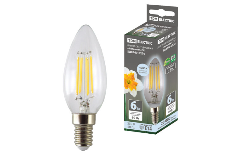 Лампа светодиодная "Филамент" С37-6 Вт-230 В-4000 К–E14TDM (кр.10шт)
