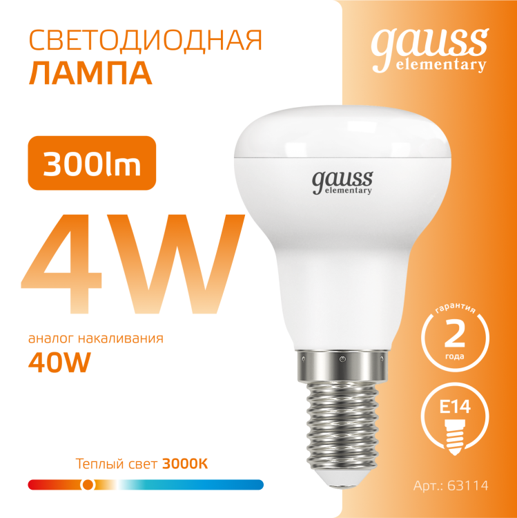 Лампа Gauss Elementary R39 4W 300lm 3000K E14 LED 1/10/50