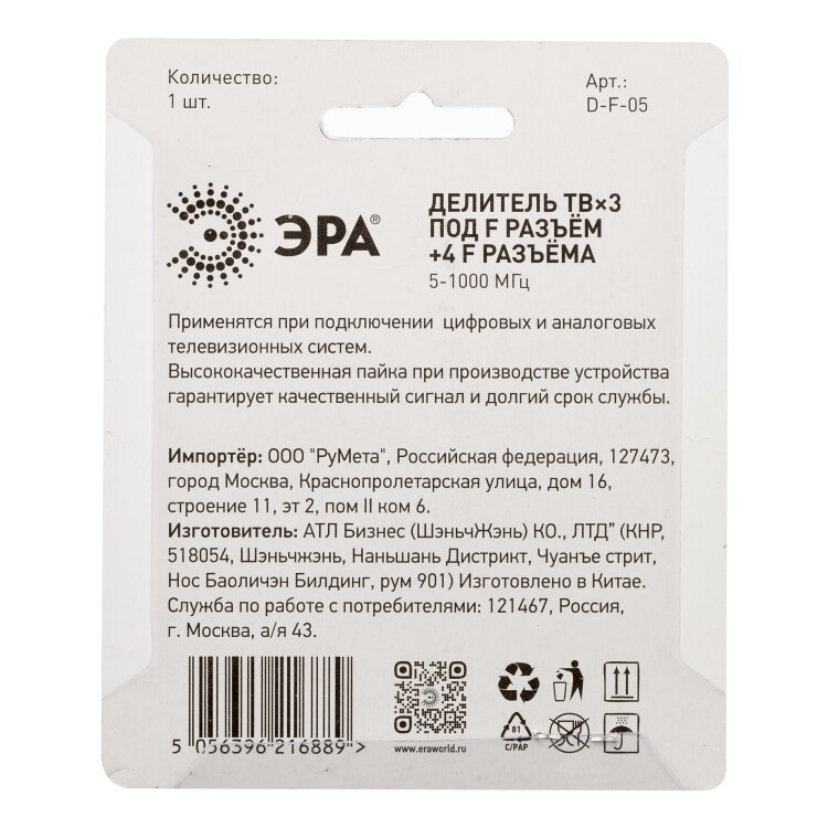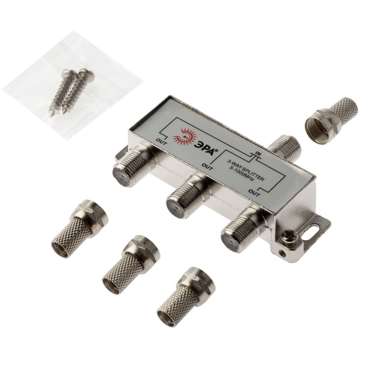 Делитель ТВ ЭРА 3 ответвления под F разъём в комплекте 4 F разъёма 5-1000 МГц упаковка 1 шт. (кр. 1шт)