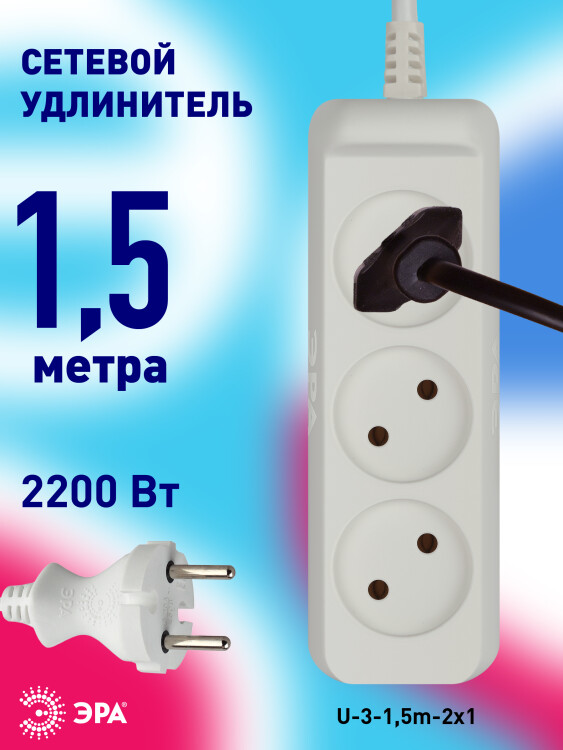 Удлинитель электрический Эра U-3-1,5m без заземления, ПВС, 2x1мм2, 3 розетки, 1,5м. Рассчитан на максимальную мощность 10А/2200 Вт. Удлинитель Эра станет Вашим надежным помощником, если Ваши любимые электроприборы находятся далеко от розеток. Провод в удлинителях Эра сделан из 100% меди, что делает его абсолютно пожаробезопасным. Корпус выполнен из ударопрочного и негорючего пластика (полипропилен). В моделях с заземлением у вилки есть кольцо для удобного извлечения из розетки. Модель удлинителя на 10А позволяет подключить мощные бытовые приборы общей нагрузкой до 2200Вт. Не бойтесь включить чайник, обогреватель, микроволновку или другие электроприборы. Толстый провод удлинителя Эра гарантирует полную безопасность. Дизайн удлинителя разработан в России командой Эра Style.
