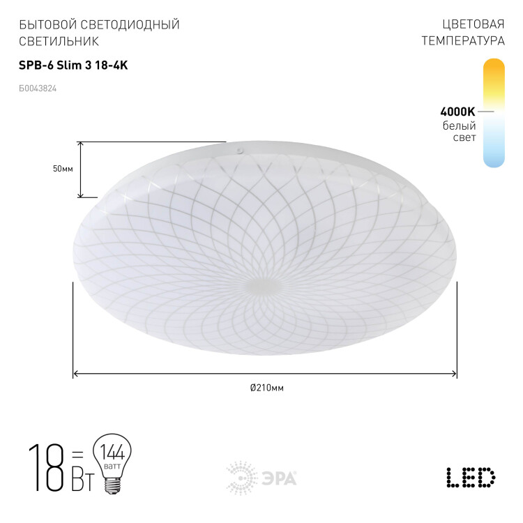 Изящный потолочный светильник SPB-6 "Slim 3" 18-4K от бренда ЭРА прекрасно дополнит любое дизайнерское решение. Наружный диаметр составляет 21 см. Стальной корпус светодиодной люстры обладает противоударными свойствами и отделан глянцем.Электросветильник имеет светодиод с нейтральным холодно-белым свечением. LED светильник имеет мощность 18 Вт и равномерное светораспределение.Плафон потолочной люстры выполнен из матового пластика, защищающего от воздействия прямого света. Рассеиватель декорирован блестящим узором, напоминающим солнце. Неповторимый дизайн идеально гармонирует с круглым плоским корпусом светильника и создает атмосферу уюта. Это позволяет использовать SPB-6 "Slim 3" 18-4K для освещения прихожей, гостиной или спальни.Светодиодная люстра имеет средний срок службы в 30 000 часов и I класс защиты заземление. Такой источник света прослужит Вам долго и бесперебойно. Купить светильник от компании ЭРА значит выбрать высокое качество по оптимальной цене.