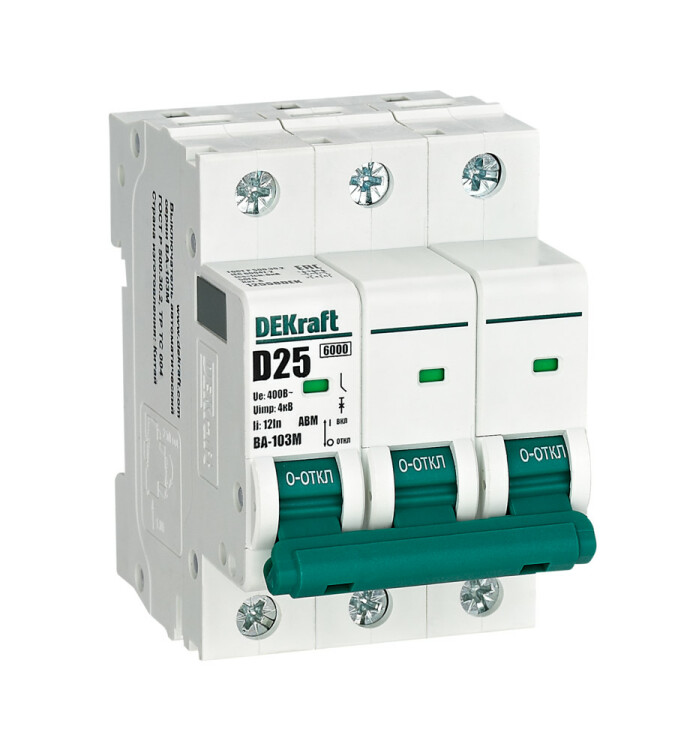 Автоматический выключатель без теплозащиты серии ВА-103M DEKraft; 3P; ном. ток 25 А; ном. раб. напряжение 400 В; кривая отключения D. Автоматические выключатели серии ВА-103М имеют специальное назначение для систем противопожарной защиты и вентиляции и выдерживают ток КЗ до 6000 А. Также они могут использоваться для нечастых оперативных включений и отключений указанных цепей. Автоматические в ыключатели соответствуют директиве RoHS, имеют расширенный диапазон рабочих температур от -25 до +60 °C, удобны и безопасны в эксплуатации.