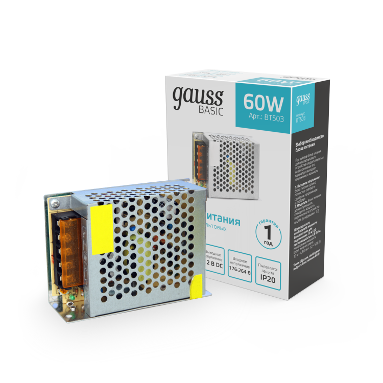 Gauss Basic 12V 60W IP20 1/120 идеально подходит для использования со световыми приложениями, обеспечивает высокую яркость и надежность благодаря своим высоким техническим характеристикам.