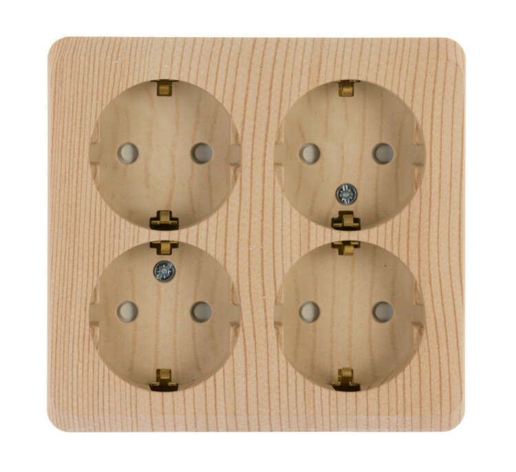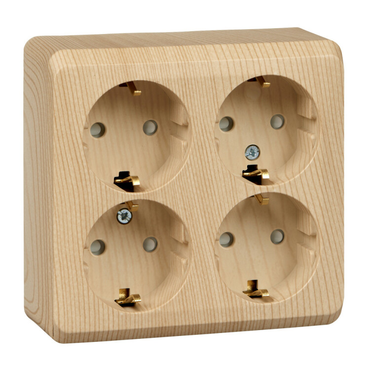 Розетка Systeme Electric (ранее Schneider Electric) ЭТЮД (сосна, открытой установки) четырёхместная с заземлением и шторками предназначена для применения в сетях до 250В, на ток до 16А. Четырёхместная розетка позволяет подключить четыре устройства в одном месте. Шторки и заземление обеспечивают дополнительную безопасность при косвенных прикосновениях. Изделия цвета Сосна обладают уникальным рис унком, напоминающим древесный сруб. Сделано в России.