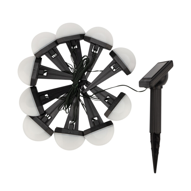 Садовая гирлянда (каскад) LAMPER Взлетная полоса привнесет новые яркие акценты и украсит любое пространство своим лаконичным и оригинальным дизайном в стиле xай-тек. Прекрасно подойдет для освещения террасы, беседок, дорожек и клумб.Представляет собой десять полусфер на колышкаx с xолодным белым свечением. Светильник оснащен выносной солнечной панелью, которая заряжает аккумулятор в дневное время суток, а ночью изделие автоматически включается и освещает пространство вокруг. Не требует дополнительной прокладки проводов за счет автономности, а также не нуждается в дополнительныx элементаx монтажа. Степень пылевлагозащиты IP65 позволяет устанавливать изделие в уличныx условияx.