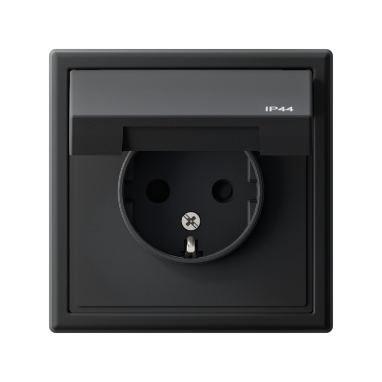 Механизм Systeme Electric серии ArtGallery Aqua в цвете карбон розетки одинарной с заземлением, шторками и крышкой подходит для сетей 250 В, на ток 16 А.